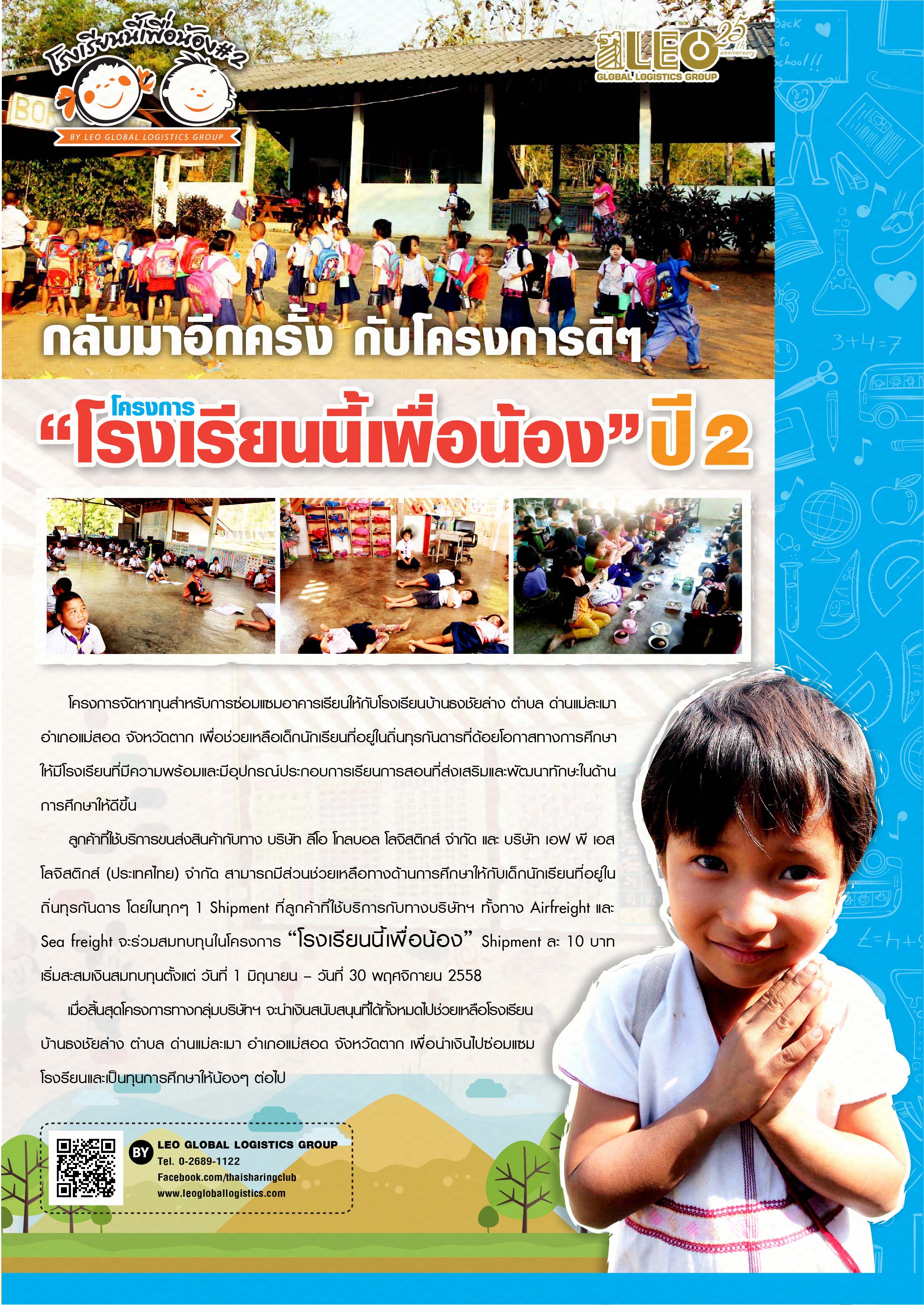 โครงการ “โรงเรียนนี้เพื่อน้องปี 2” เป็นโครงการ (Corporate Social Responsibility : CSR) หนึ่งของกลุ่มบริษัท ลีโอ โกลบอล โลจิสติกส์ ) ที่ทางบริษัทฯ ได้จัดขึ้นต่อเนื่องมาเป็นครั้งที่ 2 ซึ่งทางบริษัทฯ ได้เชิญลูกค้าและพันธมิตรทางธุรกิจ เข้ามาเป็นส่วนหนึ่งของโครงการอีกเช่นเคย โดยการสมทบทุนจากการใช้บริการของทางบริษัทฯ การซื้อสินค้าต่างๆ ในโครงการ อาทิเช่น ร่ม ถุงผ้า สติ๊กเกอร์ Line N’ OLE & P’ LEO หรือการบริจาคสิ่งของที่จำเป็นสำหรับโรงเรียน