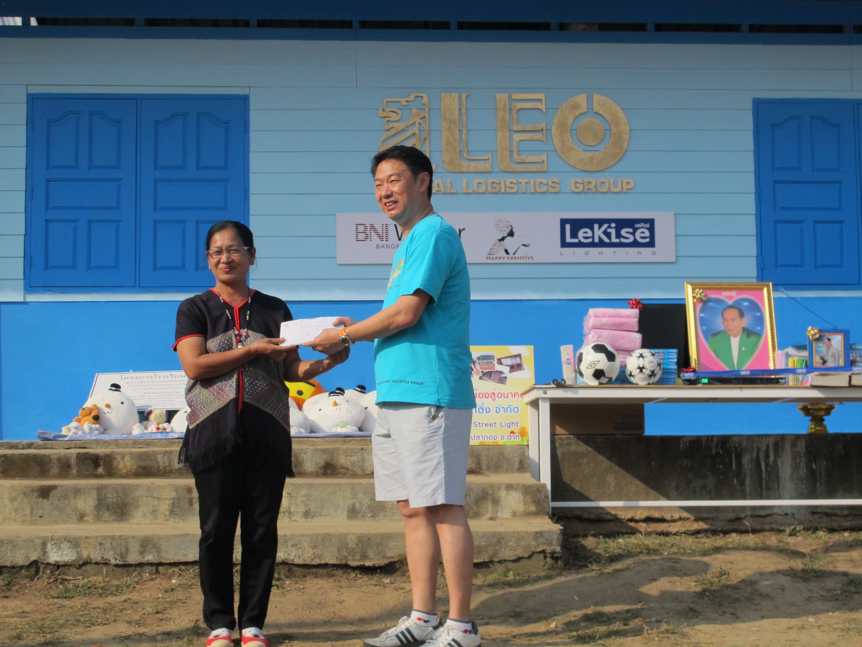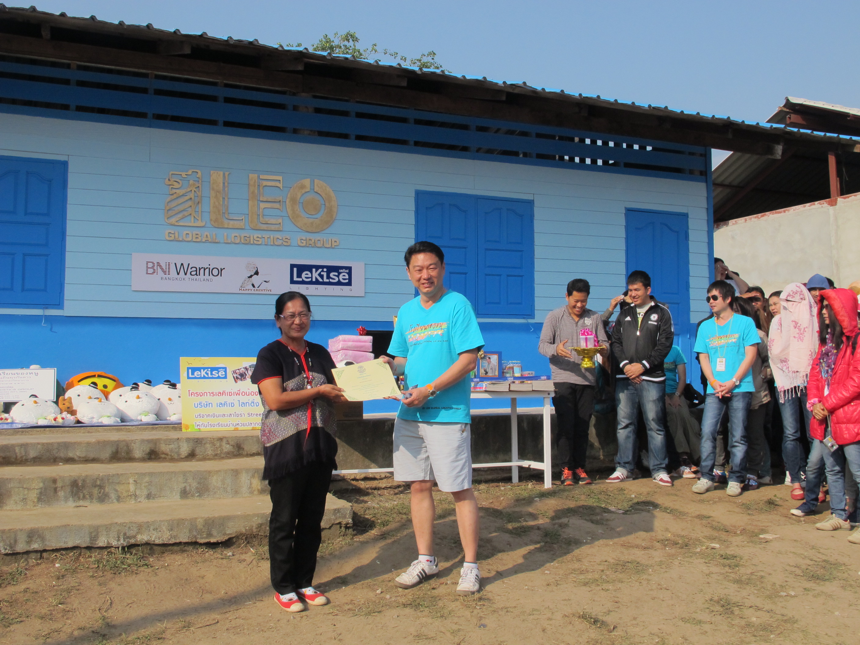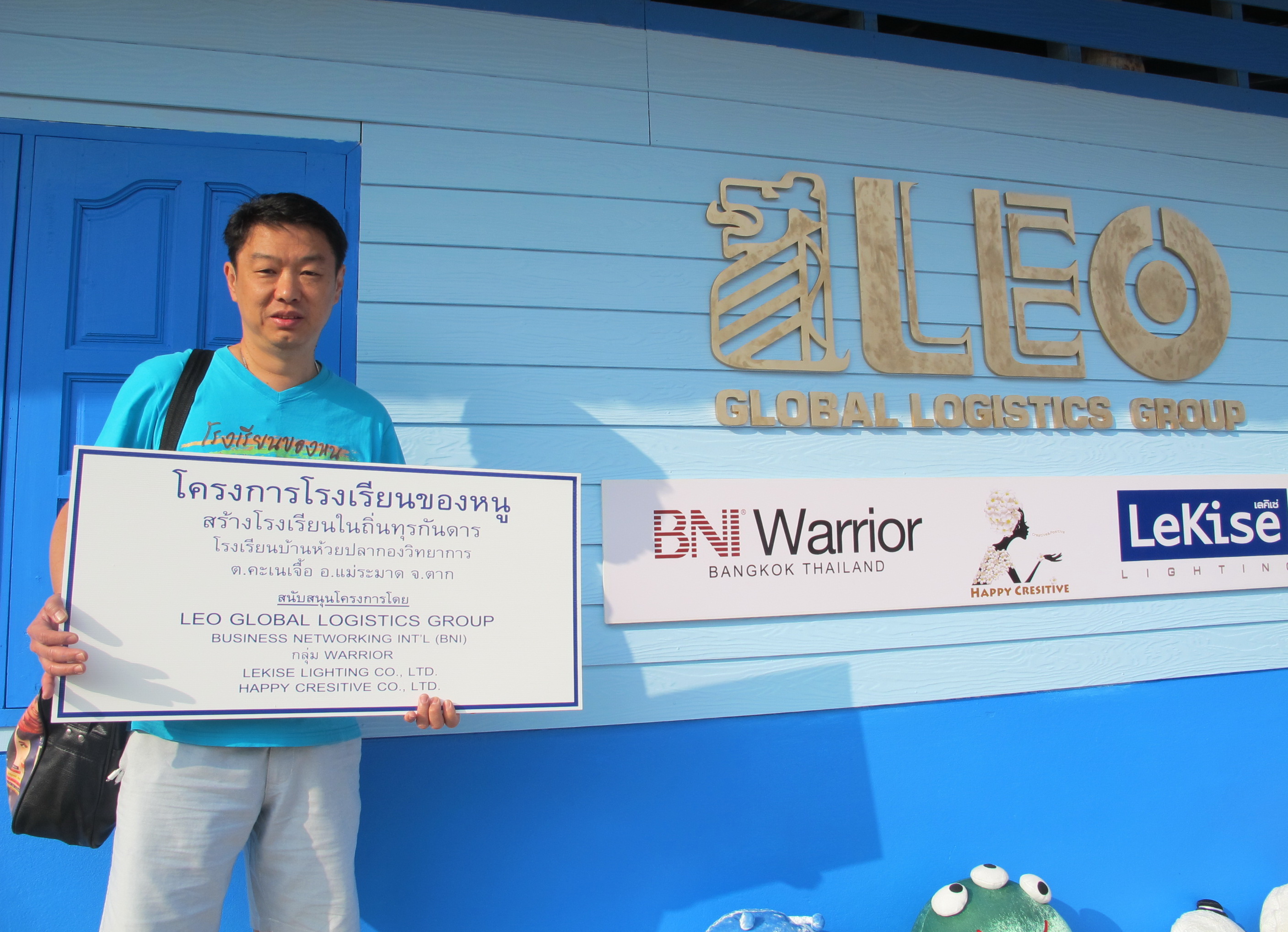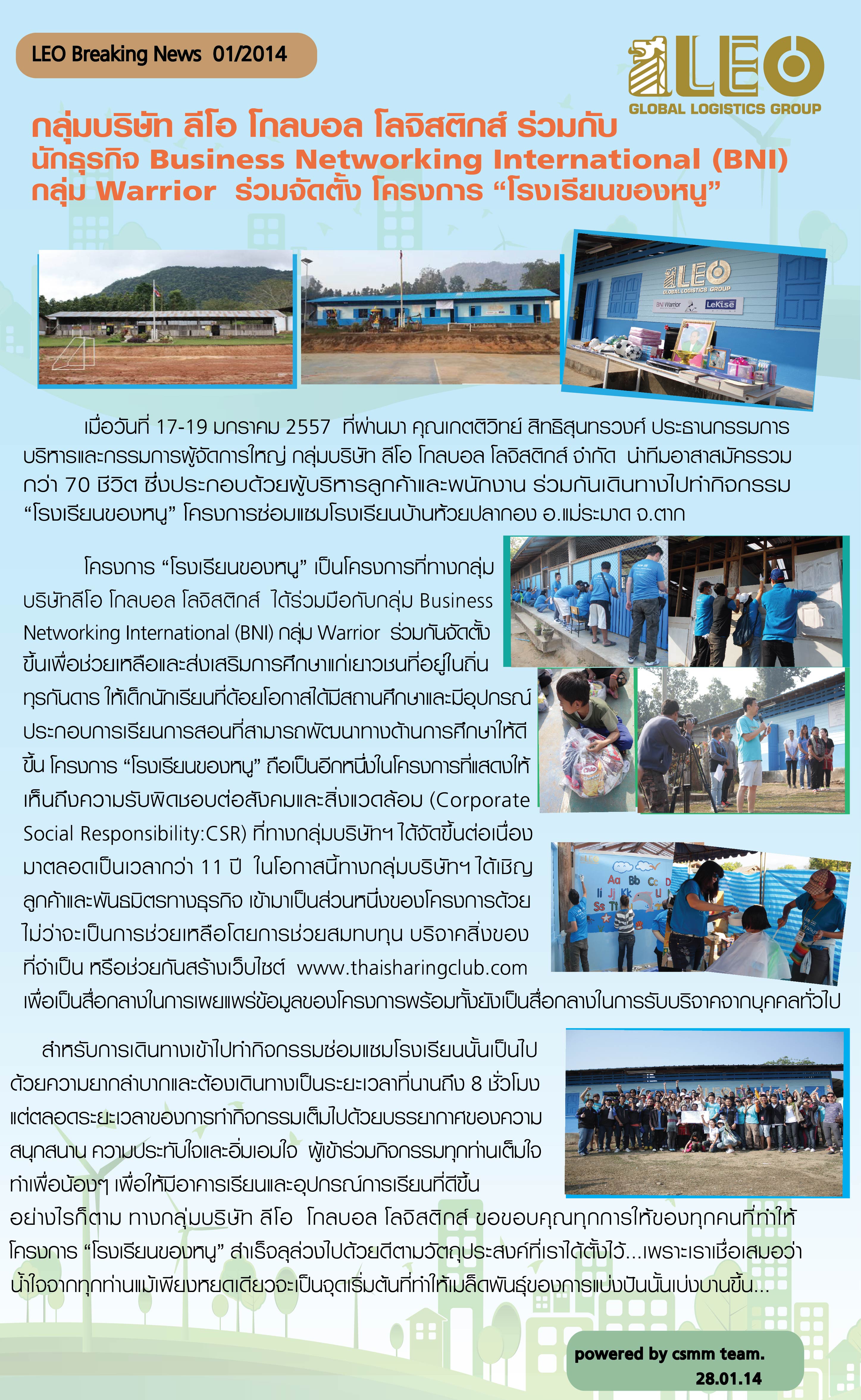 บริษัท ลีโอ โกลบอล โลจิสติกส์ ได้ร่วมมือกับ Business Networking International (BNI) กลุ่ม Warrior ร่วมกันจัดตั้ง “โครงการโรงเรียนนี้เพื่อน้อง” ขึ้นมาเพื่อช่วยเหลือและส่งเสริมการศึกษาแก่เยาวชนที่อยู่ในถิ่นทุรกันดาร ให้เด็กนักเรียนที่ด้อยโอกาสได้มีสถานศึกษาและมีอุปกรณ์ประกอบการเรียนการสอนที่สามารถพัฒนาทางด้านการศึกษาให้ดีขึ้น โดยทางบริษัทฯ ได้เชิญลูกค้าและพันธมิตรทางธุรกิจ เข้ามาเป็นส่วนหนึ่งของโครงการด้วย ไม่ว่าจะเป็นการช่วยเหลือโดยการช่วยสมทบทุน บริจาคสิ่งของที่จำเป็น